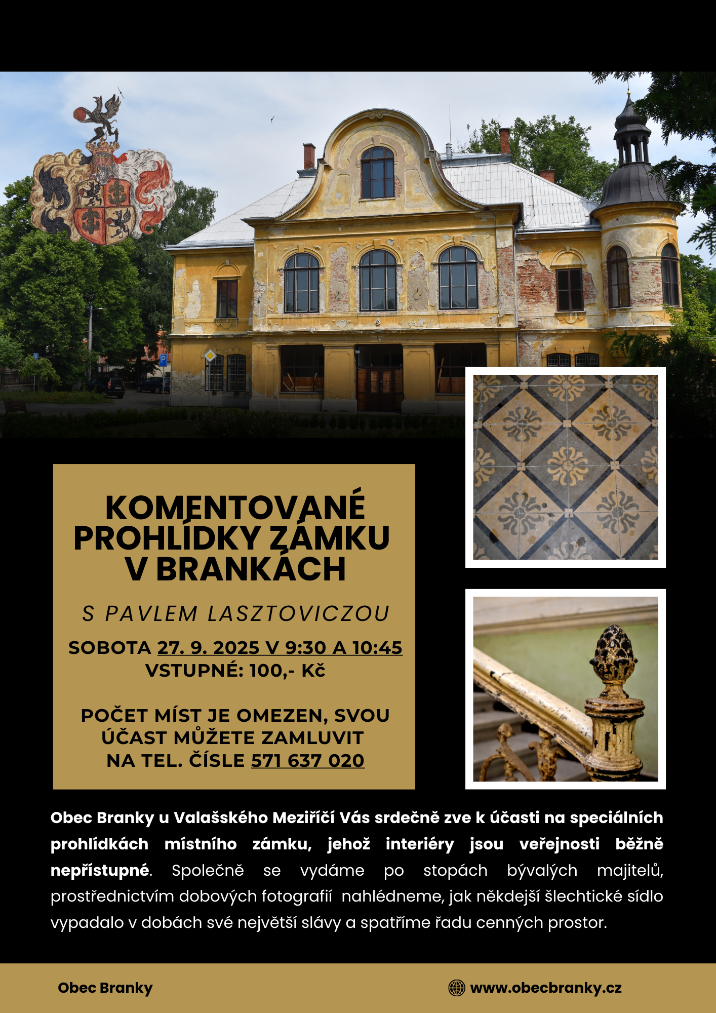 Komentované prohlídky zámku v Brankách dne 27.9.2025 od 9,30-10,45 vstupné 100,-Kč. Počet míst je omezen, účast si můžete zamluvit na OÚ v Brankách.