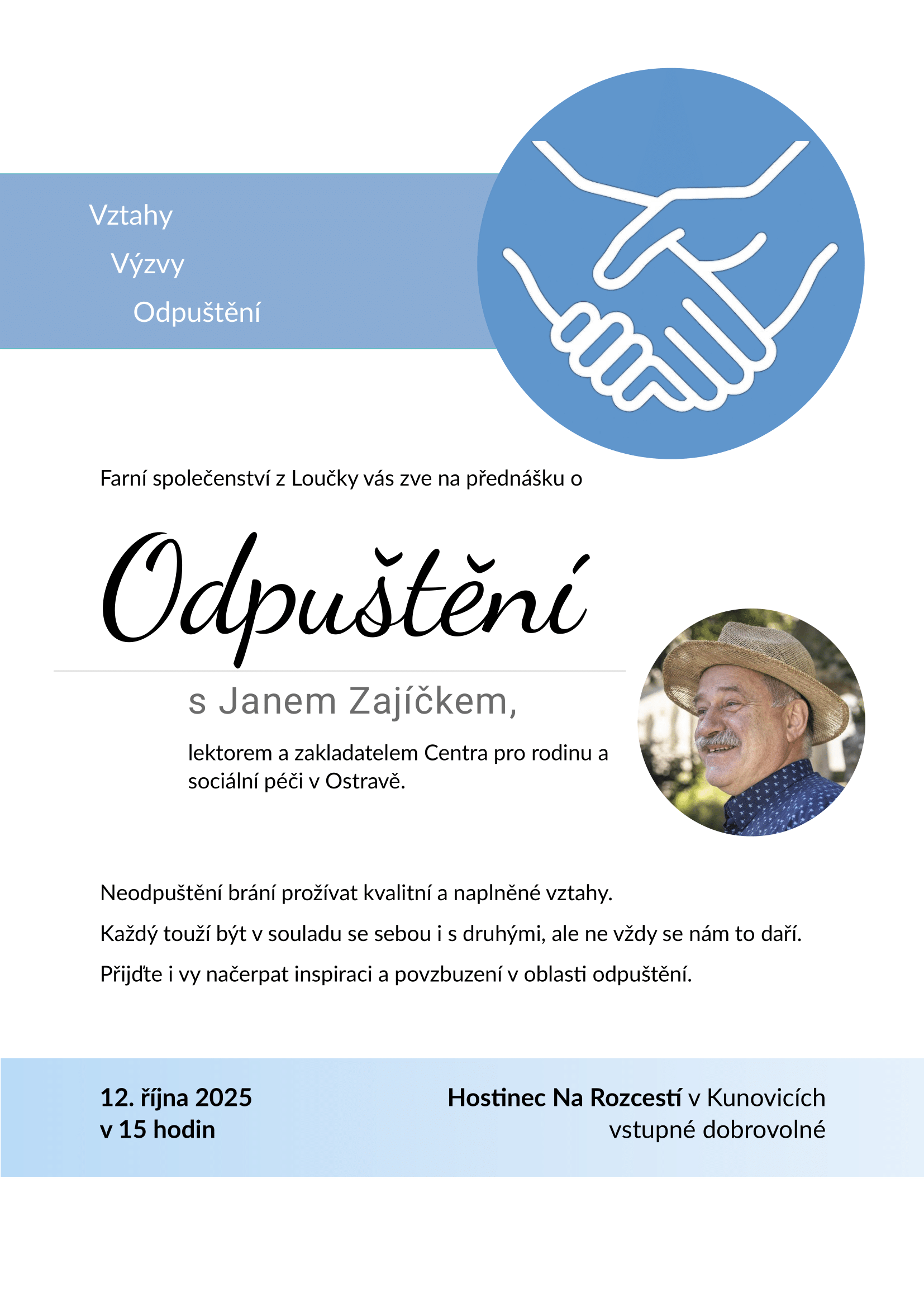 Farní společenství z Loučky Vás zve na přednášku v Hostinci Na Rozcestí v Kunovicích 12.října v 15.00 hodin.